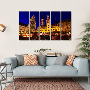 Capture the festive spirit of a lively Christmas market with this canvas wall art. The photorealistic scene showcases an illuminated Christmas tree, bustling market stalls, and classic buildings, all under a beautiful nighttime sky. Perfect for adding a holiday touch to your home decor.