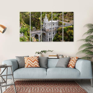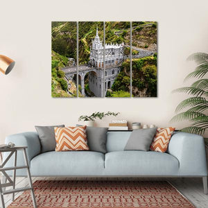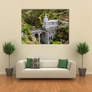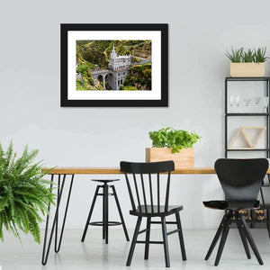 This canvas wall art captures the stunning Church of Las Lajas, a striking neogothic structure in Colombia set against a backdrop of mountains and a gorge. The serene greens and browns evoke a majestic atmosphere, bringing the beauty of this iconic place into your home.