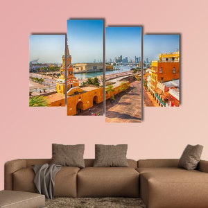 Clock Tower Gate Colombia Canvas Wall Art presents a sunlit Colombian cityscape centered on a historic clock tower and arched walkways. Rendered realistically in orange, blue, yellow and white, it captures a lively waterfront scene with palm trees and a modern skyline in the distance. The high-angle composition—with a clear foreground, middle ground and background—works well in modern living rooms or entryways.