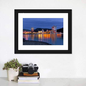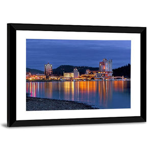 This panoramic canvas art showcases the serene city skyline of Coeur d'Alene, capturing the vibrant hues of blue, orange, and yellow. The tranquil scene features buildings and waterfront reflections, perfect for adding a calm urban touch to your decor.