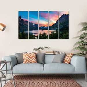 This serene canvas captures the beauty of St. Mary Lake at sunset, featuring snow-capped mountains and lush pine trees under a vibrant sky. The rich palette of blue, pink, and orange evokes a majestic atmosphere, making it a perfect addition to any nature-themed decor.