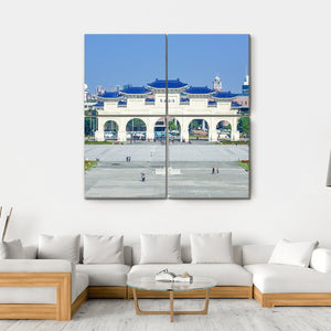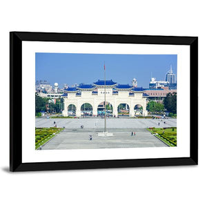 This canvas print captures the grandeur of Democracy Memorial Hall in Taipei, depicting its majestic archway against a backdrop of blue skies and greenery. The serene scene invites calm and reflection, making it a beautiful addition to any wall decor.