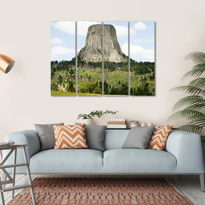 Capture the serene beauty of Devils Tower with this stunning canvas wall art. Featuring a majestic rock formation surrounded by lush pine trees and expansive grasslands under a bright blue sky, this piece brings the tranquility of nature into your space.