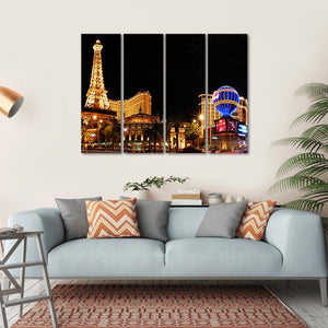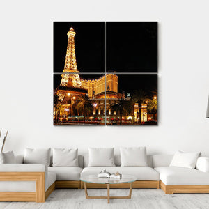 This vibrant canvas art captures a stunning replica of the Eiffel Tower amidst a lively night scene. With its illuminated buildings, hot air balloons, and palm trees, it adds a festive touch to any space.