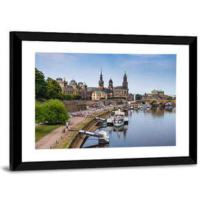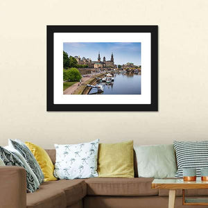 A panoramic view of the Elbe River embankment in Dresden shows the river, boats, an arched bridge, domed historic buildings and a riverside promenade. Rendered in a realistic, detailed style with a blue-green palette, it feels vibrant and lively and suits modern living spaces.