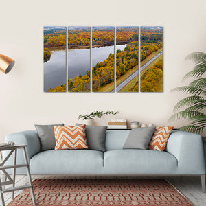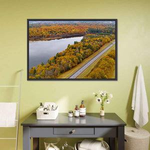 This captivating landscape features a serene river winding through an autumn forest in New England. With vibrant hues of yellow, orange, and green, it invites a peaceful ambiance, perfect for brightening up any room.