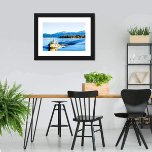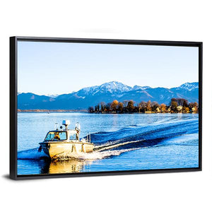 A panoramic scene of a boat cutting a wake across calm blue water with snow-capped mountains and a tree-lined shoreline. The photorealistic, vibrant image feels serene and expansive, with cool blues, whites, and greens setting a calm mood. Works well in modern living rooms, offices, or hallways that suit landscape art.