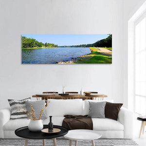 Fishing Lake Alabama Panoramic Canvas captures a wide lakeside view with trees, a rocky shoreline and a grassy embankment beneath a clear summer sky. The peaceful, natural scene—rendered in blue, green, brown and white tones—makes a calm focal point for living spaces and room decor.