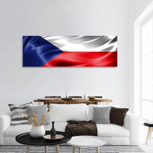 Centered on the Czech flag, this panoramic canvas print uses a bold, graphic style and a blue, white, and red palette to convey a proud, patriotic mood. The wavy fabric texture and clean composition give it a modern presence that suits contemporary rooms or offices with patriotic decor.