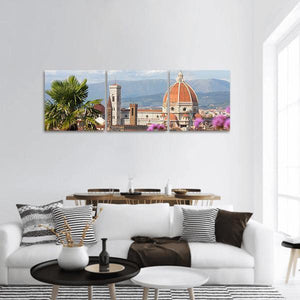 This panoramic canvas captures Florence in spring with the cathedral’s dome and bell tower beneath a bright, sunny sky. Rendered realistically in a layered, wide composition, the print pairs orange, white, blue, green, and pink tones with palm trees, distant mountains, and foreground pink flowers, well suited to modern room decor.