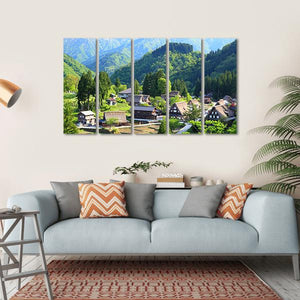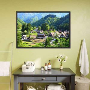 Bring the serene beauty of Gokayama, Japan into your space with this captivating landscape canvas. The artwork showcases a picturesque village nestled among majestic mountains and lush forests, featuring traditional houses with thatched roofs and terraced fields, all rendered in a calming palette of greens and blues.
