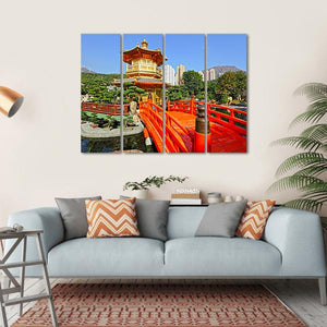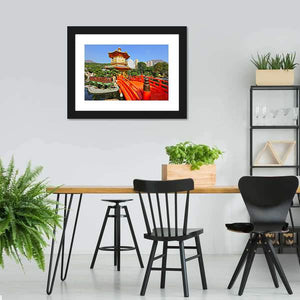 This landscape artwork features an ornate golden pagoda nestled among manicured trees, complemented by a vibrant red bridge. With a serene and traditional vibe, it captures the beauty of a Chinese garden and is a lovely addition to any room.