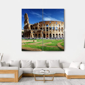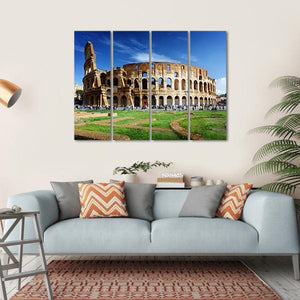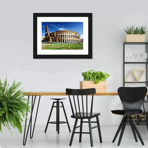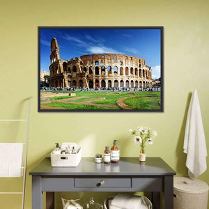 Capture the grandeur of Rome with this stunning canvas wall art depicting the iconic Colosseum framed by a vibrant blue sky and lush green field. This artwork brings a historic vibe to your space, blending beautifully with modern decor.