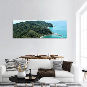 Ballena Bay, Costa Rica panoramic canvas depicts a tropical island coastline with dense green foliage, rocky outcrops and clear turquoise water. This realistic nature photograph feels serene and natural, a calming fit for coastal or modern room decor.