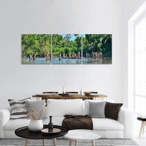 Tribe Of Asmat, Indonesia shows a lively riverside panorama with numerous people paddling canoes beside lush jungle banks. The realistic scene uses greens, blues, browns and touches of red to convey a vibrant, adventurous mood. It fits well in modern or nature-inspired rooms.