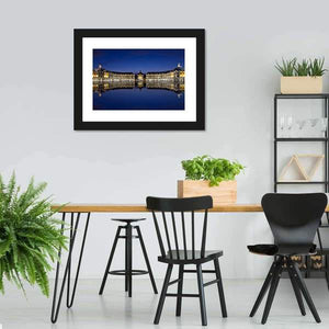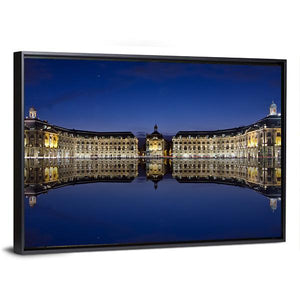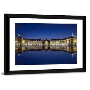 Bordeaux Reflection In Water shows a symmetrical cityscape of building facades with lit windows mirrored in calm water. The blue, yellow, white and black palette creates a calm, elegant, grand night atmosphere that works well in modern interiors.