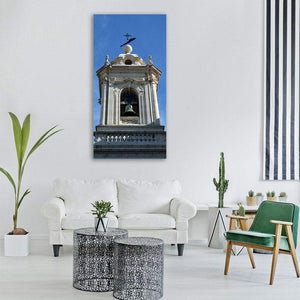 A centered view of a Lisbon bell tower featuring a bell and cross, rendered in blues, white, gray, and green. Ornate architectural details and a metal weather vane lend a majestic, serene presence that works well with modern or architecture-focused room decor.