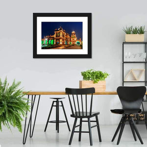 Capture the enchanting beauty of Islamia College Peshawar with this cityscape canvas wall art. Depicting the illuminated building at night, it showcases stunning arches and domes bathed in warm greens and yellows against a starry sky. This artwork adds a grand and festive atmosphere to your space.
