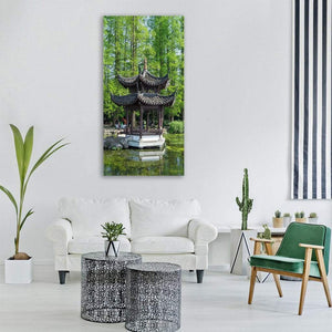 A centered scene of a traditional two-tiered pagoda beside a calm pond, set among lush green trees. The realistic, daytime composition feels serene and peaceful, with the water reflecting the ornate roof. Suits modern or nature-inspired interiors that want a quiet, natural focal point.