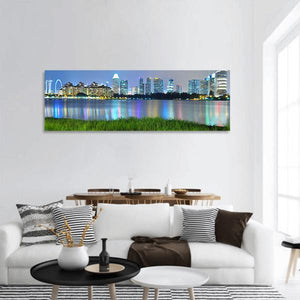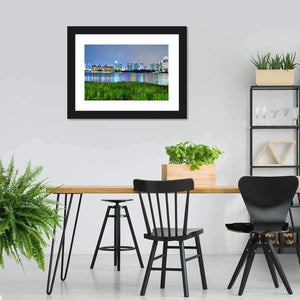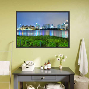 This panoramic canvas art showcases the dynamic skyline of Singapore at night, reflected beautifully on the tranquil waters of the Kallang River. Its vibrant colors of blue, purple, and green create an energetic atmosphere, making it a stunning addition to modern home décor.
