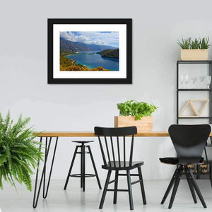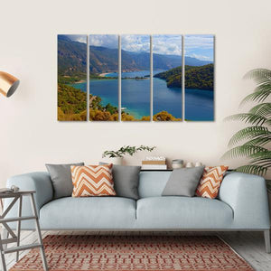 This canvas captures a serene lagoon in Turkey, framed by majestic mountains and a tranquil coastline. The aerial view showcases boats gently floating on the water, creating a picturesque scene that invites calm into any space.