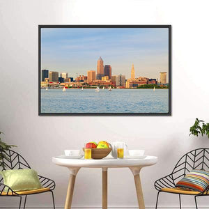 Lake Erie, Ohio panoramic canvas featuring a calm waterscape with sailboats and a distant city skyline in blues, orange and white. The modern photorealistic print feels peaceful and expansive, a scenic focal point that suits contemporary living rooms or office spaces.