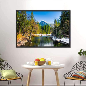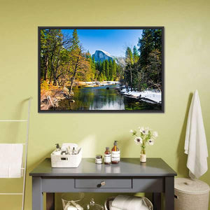 This captivating artwork features a serene river flowing near Half Dome Rock, surrounded by majestic mountains and a rich forest. The blend of green and blue hues create a peaceful atmosphere, making it a beautiful addition to any nature-inspired décor.