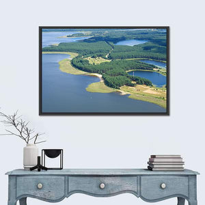 This panoramic canvas art captures the serene beauty of Lake Seliger, showcasing its winding coastline and lush forest. The tranquil blue and green hues evoke a natural, vast landscape that adds a peaceful touch to any space.