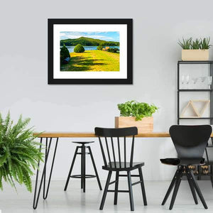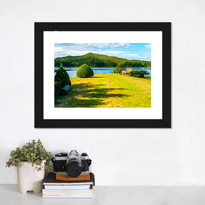 Mae Puem Reservoir Panoramic Canvas depicts a tranquil lake scene with hills, green conical trees and a small hut with a thatched roof. Rendered in a realistic style with green, blue, yellow and brown tones, it creates a peaceful, serene atmosphere that works well in modern or nature-inspired rooms.