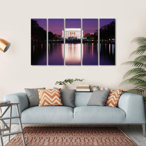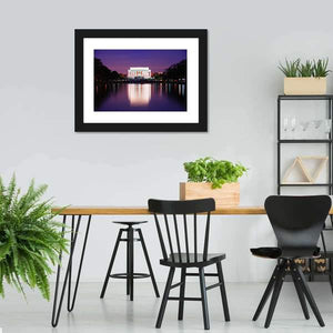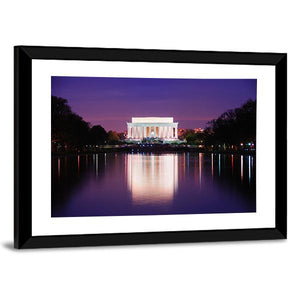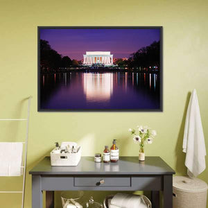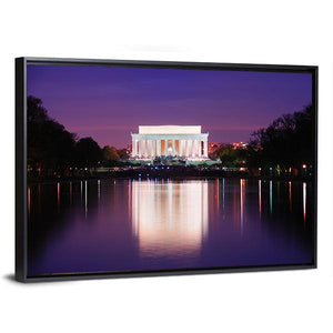 This canvas showcases the Lincoln Memorial and the Reflecting Pool set against a serene sunset backdrop. The majestic scene is accented by a palette of purple, pink, and blue, creating a peaceful atmosphere that captures the beauty of Washington D.C. at twilight.