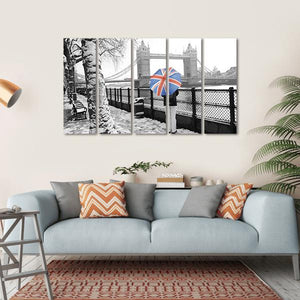 This canvas wall art captures the serene beauty of London's Tower Bridge on a snowy day. Featuring a striking winter scene with a Union Jack umbrella and snow-covered trees, it brings an atmospheric touch to any space.