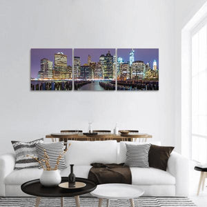 A panoramic night view of the Lower Manhattan skyline with illuminated skyscrapers and calm water reflecting blue, purple, gold, and grey tones. The modern, photorealistic image carries a vibrant, urban, majestic mood and suits contemporary living rooms or offices as cityscape wall decor.