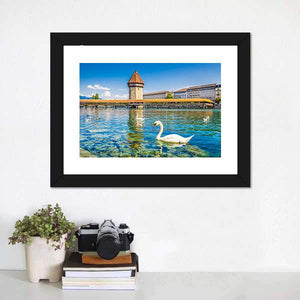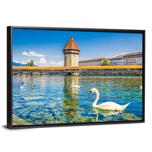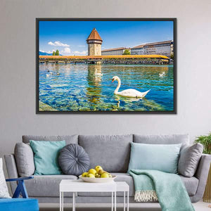 This canvas art captures the serene beauty of a covered bridge in Switzerland, complemented by a picturesque stone tower and tranquil water. The bright palette of blue, yellow, and green evokes a vibrant, scenic atmosphere perfect for any modern space.