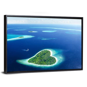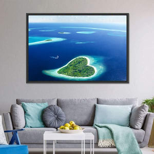 This captivating canvas depicts a heart-shaped island surrounded by clear turquoise waters. The serene and tranquil ambiance, complemented by lush greenery and a distant sailboat, evokes a romantic feeling of idyllic beauty.