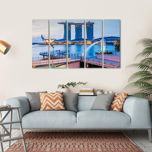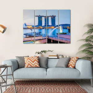 Capture the vibrant energy of Singapore with this striking cityscape featuring the iconic Marina Bay Sands and the Merlion. The artwork beautifully blends blue and orange hues, creating a dynamic feel perfect for any modern space.