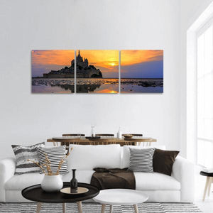 Le Mont Saint Michel in Normandy appears across a panoramic canvas, showing the abbey on its island at sunset with tidal flats and reflective water. The scene balances serene light and dramatic clouds in a warm orange, blue, purple and brown palette. It suits modern or coastal rooms as a quiet focal piece.