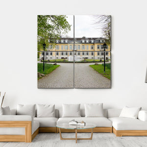 Capture the serene beauty of the Morsbroich Museum with our canvas wall art featuring a grand yellow building nestled among lush trees and a cobblestone path. The harmonious palette of yellow, green, and gray evokes a stately atmosphere, perfect for enriching any space.
