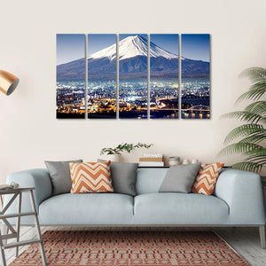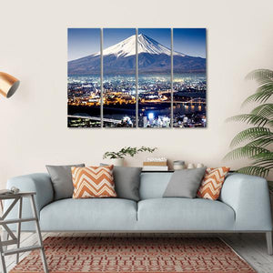 This canvas print captures Mount Fuji, showcasing its iconic snow-capped peak against a vibrant night sky filled with city lights. The serene and peaceful atmosphere creates a perfect addition to your modern décor.