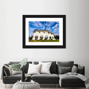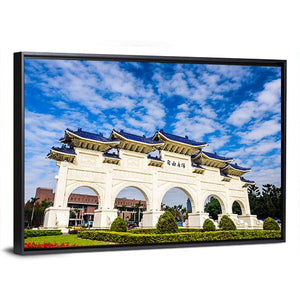 This panoramic canvas captures the Taiwan National Democracy Memorial Hall with its symmetrical archways, blue-tiled roofs and sunlit clouds. The realistic landscape feels grand, serene, and bright, making a calm focal piece for modern interiors and room decor.
