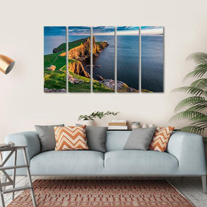Capture the serene beauty of Scotland with this canvas wall art featuring the iconic Neist Point lighthouse, craggy cliffs, and a tranquil ocean. The soft hues of blue and green complement the swirling clouds, creating a peaceful atmosphere perfect for any nature lover.