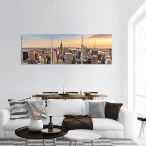 A realistic panoramic canvas of the New York Midtown skyline, showing skyscrapers and the Empire State Building in an urban, golden-hour light. The aerial, high-detail view highlights blue, grey, brown, and warm yellow tones and brings an expansive city mood that works well with modern living rooms or office spaces.
