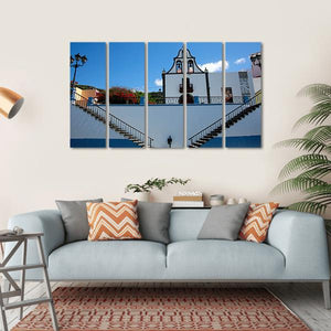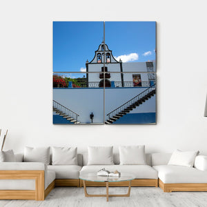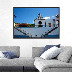 This canvas art captures the serene beauty of the Parish Church of San Miguel in Spain. Featuring a striking white building with a bell tower and dual staircases, this realistic piece brings a bright, peaceful ambiance to any space.