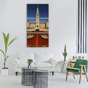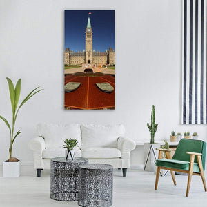 Parliament Hill’s Peace Tower is captured in a wide-angle, symmetrical, low-angle photorealistic view under a clear, sunny sky. The fountain, Canadian flag, clock on the tower and people on the plaza add historic scale and presence — a cityscape piece that fits well in modern living rooms or offices.
