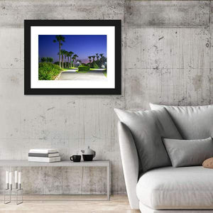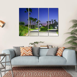 This canvas artwork captures a serene pathway lined with palm trees against a tranquil nighttime sky in Turkey. Illuminated by soft streetlights, the scene evokes a peaceful atmosphere, perfect for enhancing your living space.