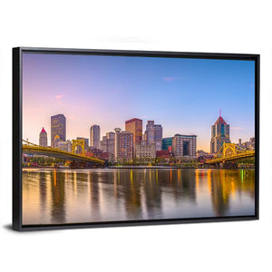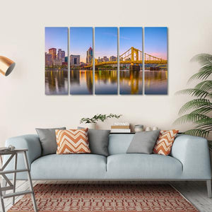 This vibrant canvas art captures the serene beauty of the Pennsylvania skyline reflecting on the Allegheny River. Featuring a striking yellow suspension bridge against a palette of blue, orange, and brown, it adds a modern touch to any landscape art collection.