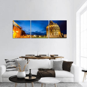 Pisa Tower In Twilight Time Panoramic Canvas places the bell tower and surrounding buildings in a cinematic, photorealistic evening scene. Deep blues, warm yellow highlights and illuminated architecture create a majestic, historic mood that recalls twilight over the city. Suits modern or historic-inspired interiors and works as a calm, dramatic focal point for room decor.