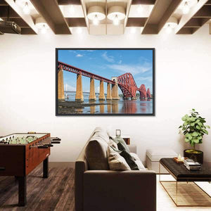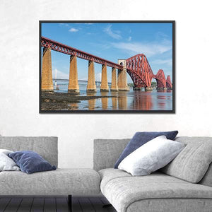 This landscape artwork captures the majestic railway bridge over the Firth of Forth in Scotland. Featuring a grand and peaceful mood, the photorealistic print showcases vibrant blues and warm earth tones that reflect the serene water and sky.