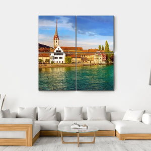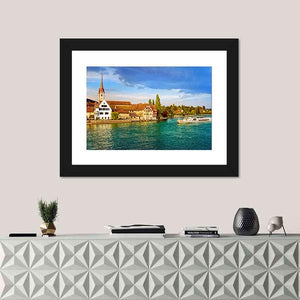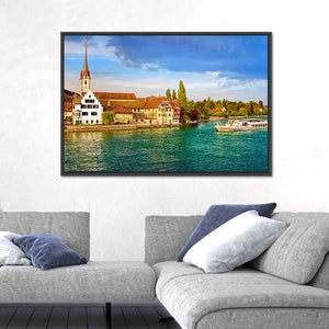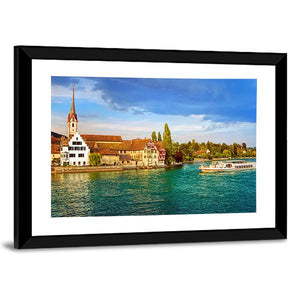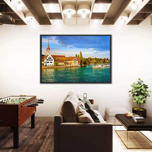 Bring a piece of Switzerland into your home with this serene canvas depicting the Rhine River, charming boats, and a picturesque town. The bright palette of blues, greens, and earthy tones creates a peaceful atmosphere, making it an excellent choice for any wall decor.