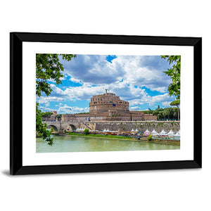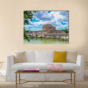 This vibrant artwork beautifully captures Castel Sant Angelo, set against a scenic view of the River Tiber in Italy. The bright colors of blue, green, and brown reflect a sunny day, bringing a touch of history and charm to your space.