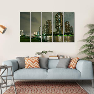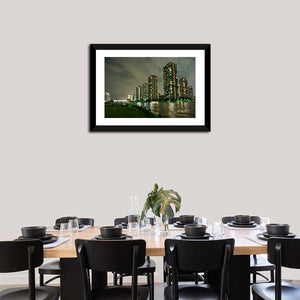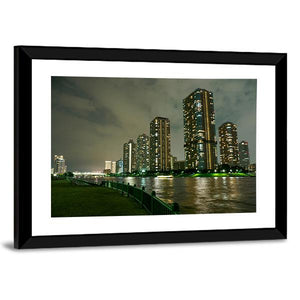 The Riverside Promenade Japan canvas art captures an urban city skyline illuminated at night, with vibrant reflections on the river. Its modern style and rich color palette of blue, green, and yellow make it a striking addition to any décor.